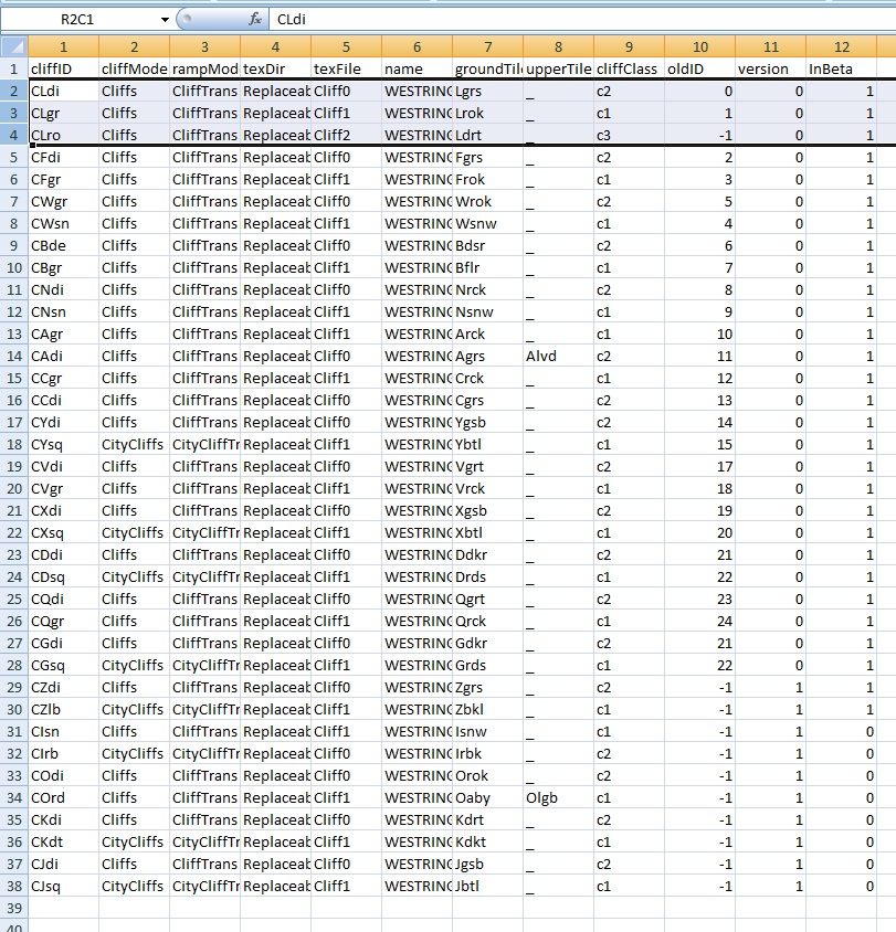 2. cliffSet - если не равен -1, то это вот те тайлы которые будут отображаться в пунктиках Дополнительные текстуры - Базовые текстуры склонов (см выше скрин где мы пытались добавлять стандартными средствами редактора) а их tileID начинаются с буквы "c", второй буквой идет ландшафт (cAc2, cBc1, cOc1...).