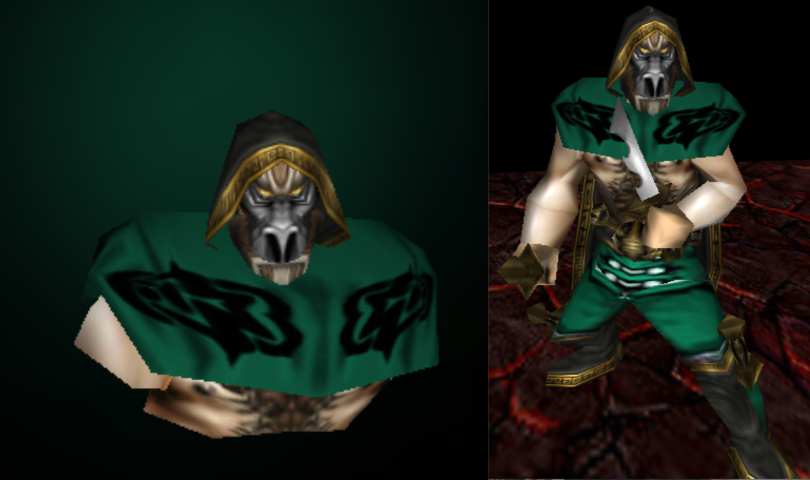 Я особо не стал париться, по изготовке текстур, просто взял стандарт кожу кентавра для торса. И кожу панды для штанишек, правда в игре зеленой я не видел, потому я её реколорнул, я не знаю почему панда) просто первое что попалось на глаза, мог ведь взять просто друида, так что из импорта только кожа пандарена. Ну, а после оставалось сделать маску - опять же не стал морочить голову) выпилил голову с Йети и сделал как альтернативную версию с маской (головой) йети))