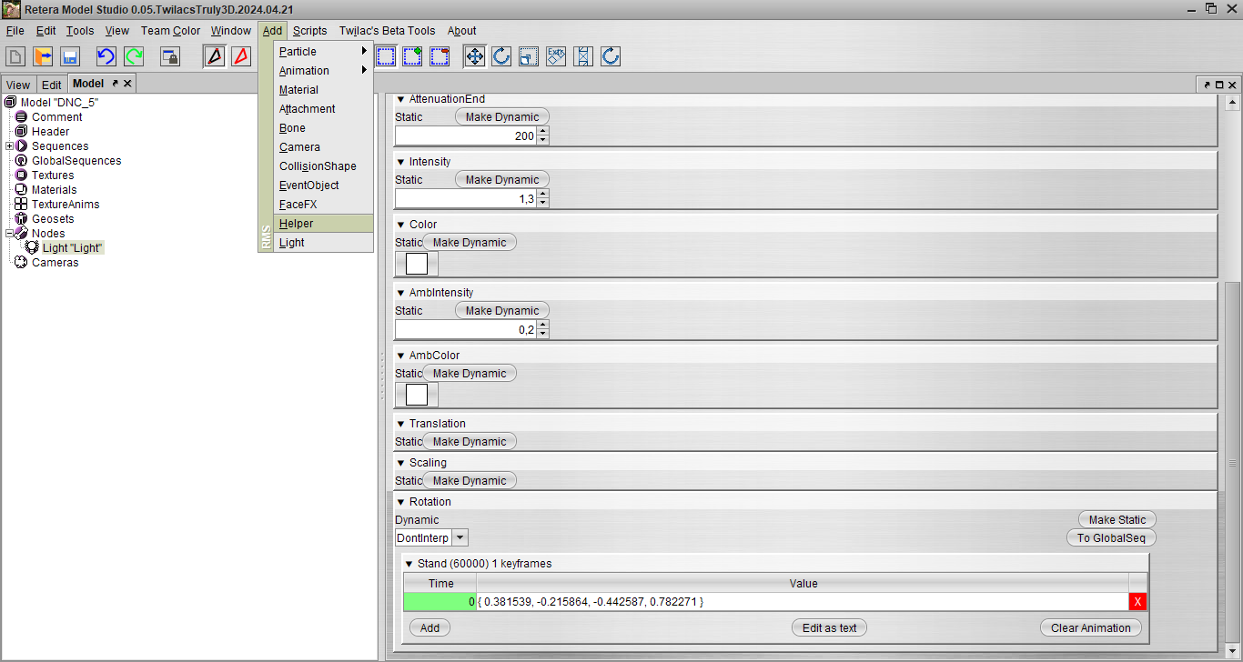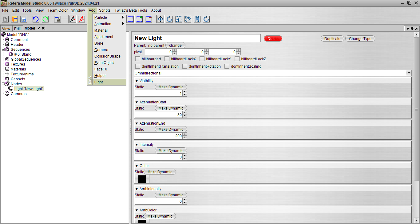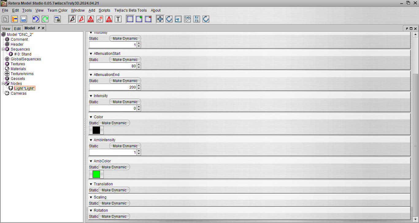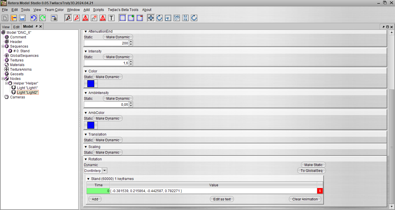 Для этого типа имеет смысл изменять значения Intensity (в DNC обычно от 0 до 2) и Color, AmbIntensity (в DNC обычно от 0 до 1) и AmbColor, а так же Rotation.