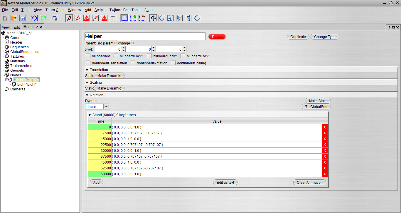 - Есть зачем-то глобальная анимация с длиною в 0 кадров, через нее осуществляется поворот источника света Rotation на привычный игроку угол. Непонятно на кой хрен это сделано когда можно через анимацию Stand. В DNC кстати глобалки полноценно не работают.