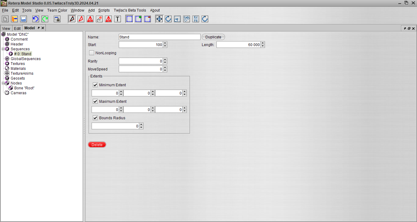 Дальше мы будем работать только на вкладке Model. Можем зайти в корень модельки и занулить такие значения как Minimum Extent, Maximum Extent, Bounds Radius, они нам не нужны.