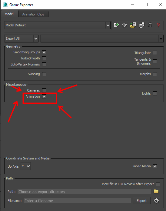 Внутри гейм экспортера, ставим галочку, что хотим перенести анимации