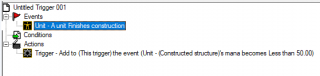 Юнит завершает строительство => Триггер: добавить новое событие: (указать нужный триггер) Мана (Построенное здание) > 50.0