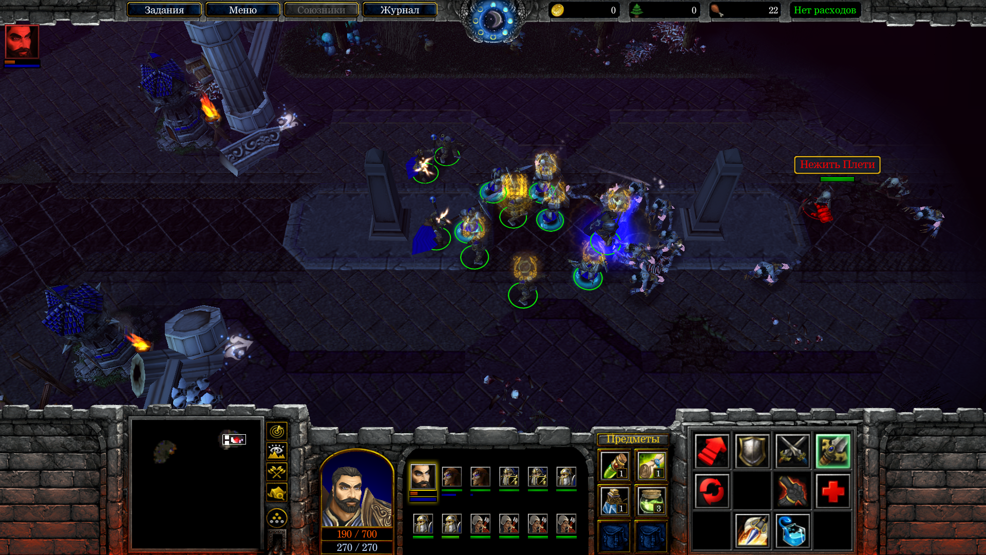 - Кстати! Время от времени в картах что-то ломается и войска начинает носить по таким е… буеракам и неровностям, что только диву даёшься и ищёшь место, где их можно вывернуть обратно на дорожку поровнее. И этот же глюк ломает и без того небалансную сцену умерщевления блонды-некромантки, когда из войск есть два полуживых героя и пара калек из эскорта, а на той стороне все жирные, здоровые и нашпигованные маной по уши. Но ведь у нас же есть перенастроенный перлипорт, верно? Дерёмся, в острый момент перлипортируемся к фонтану маны, чиним обувку и меняем испачканные кровью рубахи, идём обратно доделывать дело… а хрен там плавал – вас носит по долинам и по взгорьям, а на тропе стоит невидимая стенка. Боссовая арена, ясно. А перлипорт тогда чего работает?