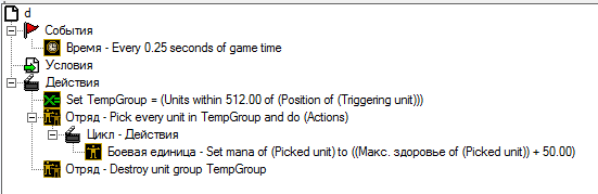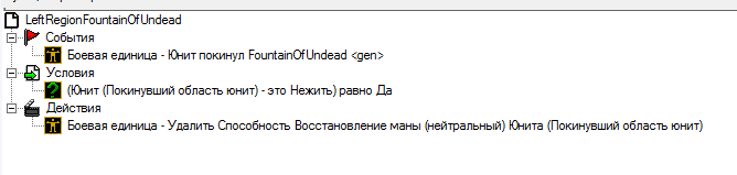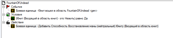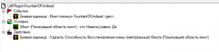 Хотел сделать источник маны, вокруг которого будут восстанавливать свою ману только армия нежити. Кажется, простейший до невозможности триггер, но такая проблема: по непонятной причине, восстановление маны работает только, когда в зелёной области 2 юнита, если будет 1 - никакого регена не произойдёт. Из-за чего такое происходит? Помогите, пожалуйста.