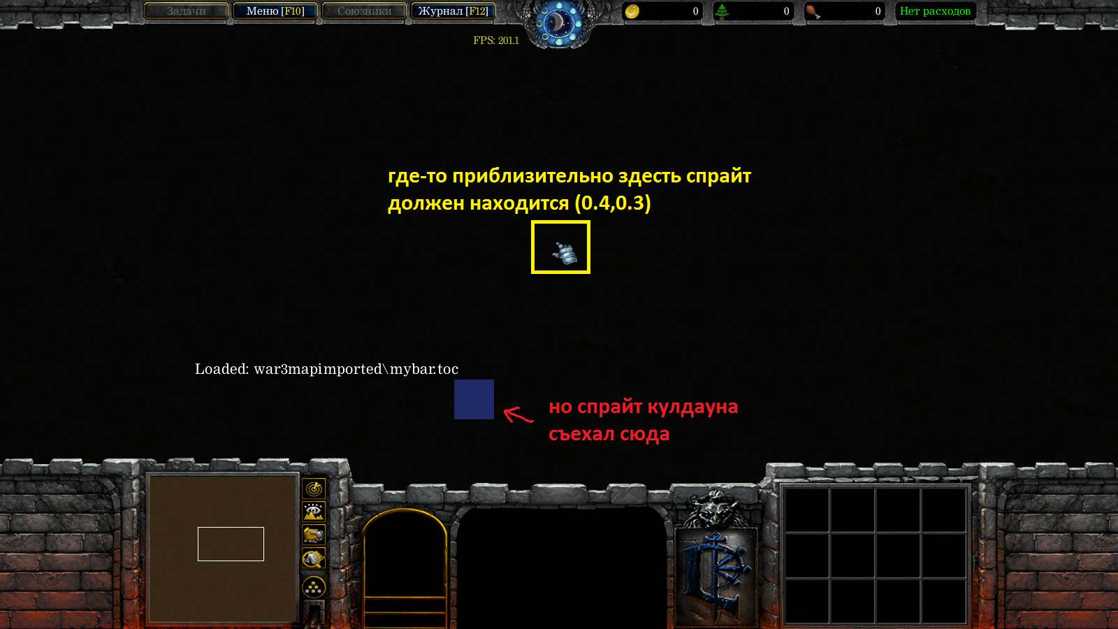 Как видим теперь изображение стоит на месте. Поскольку модель кулдауна имеет размеры приблизительно 0.039 x 0.039 (на сам деле, чуть больше чем 0.039), но вы не можете изменить размер модели спрайта через BlzFrameSetSize. BlzFrameSetSize можно задавать только наводящему фрейму, точнее родителю parent. Изменяешь parent, изменяется и child.