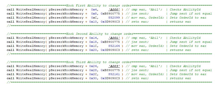 Это не то что вам нужно, этот хук (кстати он не единственный) настраивает абилке берсерка другой ИД приказа, позволяя добавить 1 юниту 100500 абилок на основе берсерка и они не будут уходить в кд одновременно. Нужно это для того чтобы у юнита было сколько угодно абилок не сбивающих текущий приказ. Требуется абилка на основе берсерка, абилка донор приказа и этот код. ВАЖНОЕ НО, абилка донор приказа не должна использоватся в карте, по крайней мере до появления абилки берсерка с модифицированным приказом. Юнит с таким образом модифицированным берсерком должен появится на карте после выполнения этого хука, и никак иначе.