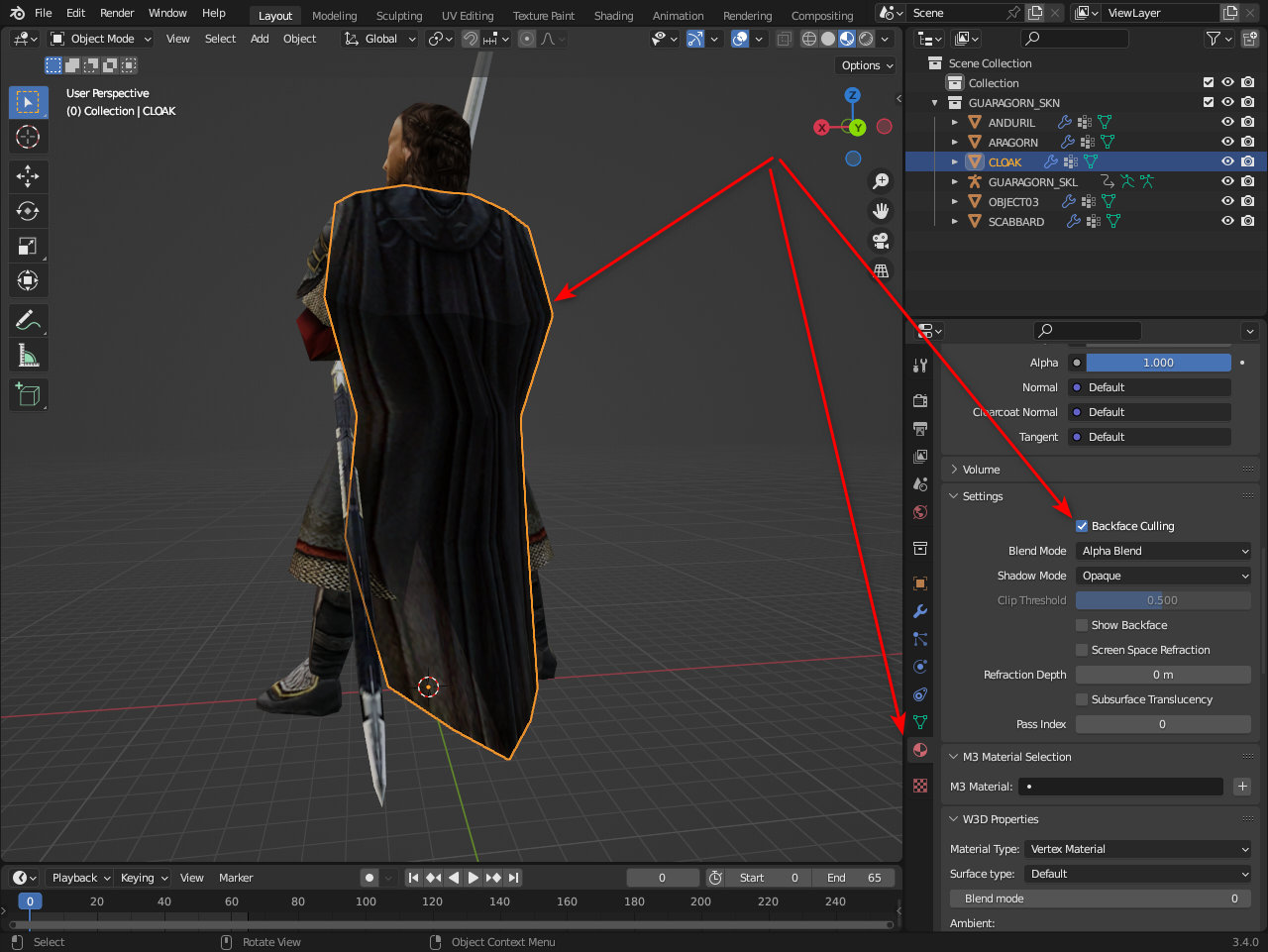 Нам нужно выделить плащ, нажать на кнопку материалы (глобус) и выбрать пункт Blackface Culling