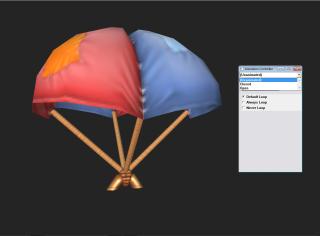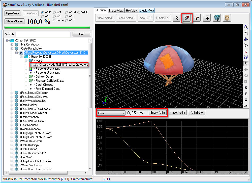 Теперь нажимаем на квадрат и у вас отобразилась модель. Сверху есть иконка "метеорит" и с помощью него можно включить проигрывания анимации. Итак, чтобы нам распаковывать модель, то мы должны открывать сбоку где модели и пока мы не доберёмся до иконки :квадрат и три квадрата", нажимаем на этот файл и у нас сверху горят кнопки - ExportXom3D и ImportXom3D. Нажимаем ExportXom3D, выбираем место извлечения и всё - готово. Модель и текстура распаковалась. Теперь извлечем анимации (если они есть). Да, в модели парашюта они есть. Выбираем сбоку квадрат модели парашюта и внизу выбираем анимацию, нажимаем кнопку Export Anim.