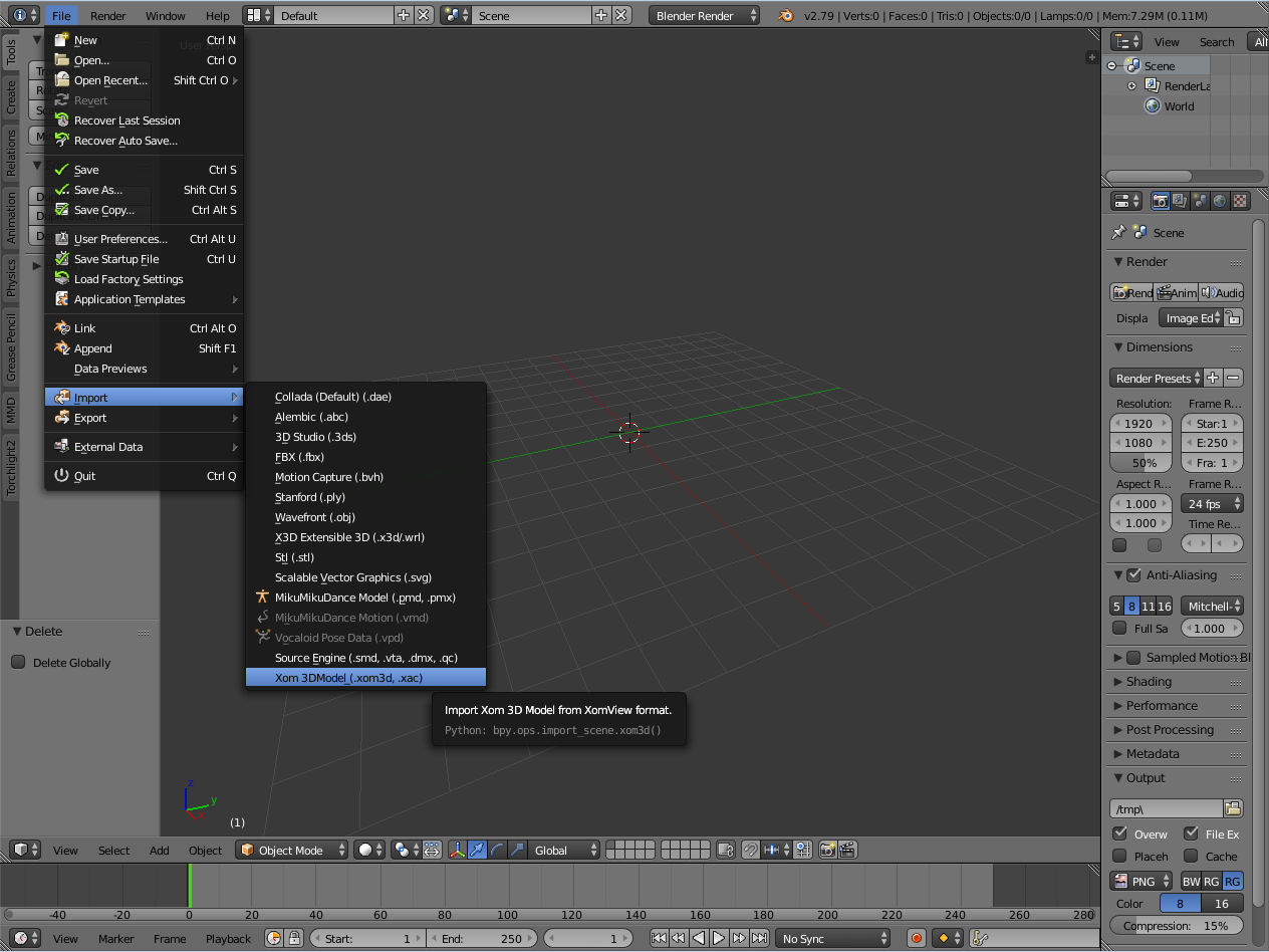 Давайте открывать Blender и начнем импортировать модель. Верху жмём File -> Import -> Xom3DModel и выбираем нашу модель в расширении .xom3d