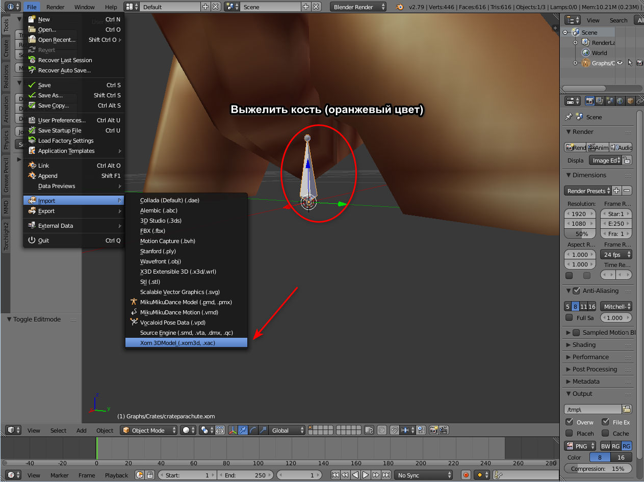 Теперь нужно импортировать анимации! Ищите кость, нажмите на неё (оранжевый цвет) и теперь File -> Import -> Xom3DModel. Выбираете файл в расширении .xac
