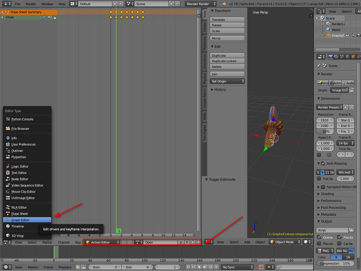 В первом окне 3D View (снизу серый квадрат) выберите Graph Editor и потом переключитесь на Action Editor