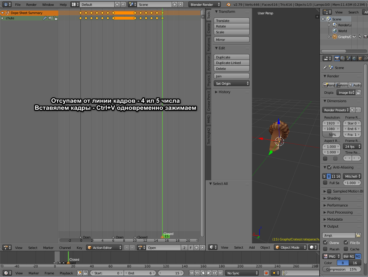 Теперь нам нужно открыть второй файл анимации (название Closed). Курсор мыши должен находиться возле квадратов, нажимаем клавишу А, выделяем всё это и потом в сбоку выделяем все кости с помощью клавиши А. Зажимаем сочетание клавиши Ctrl+C и копируем всю анимацию.