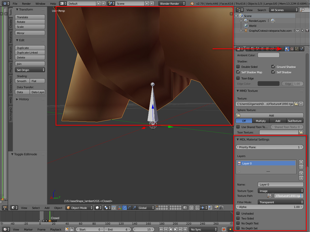 Теперь нам нужно указать путь к текстурам. Выходим во второе окно, выбираем меш модели (отдельный кусок или весь) у нас одна текстура, значит выбираем всю модель с помощью клавиши А. Теперь в сбоку, когда вы выбрали весь меш модели, найдете там иконку Material и достаем вниз и ищем MDL Material Settings.