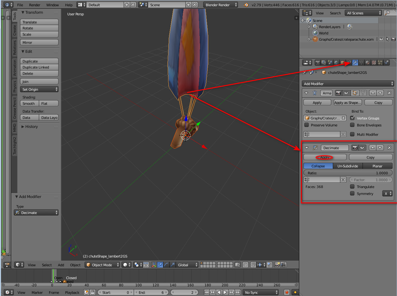 Дальше мы уже должны ознакомиться с тремя пунктами, которые выполняют свою функцию. Об этом - что такое Decimate и какие функции за что отвечают, читайте в этой статье по ссылке (там можно и прочитать про Vertex Group).