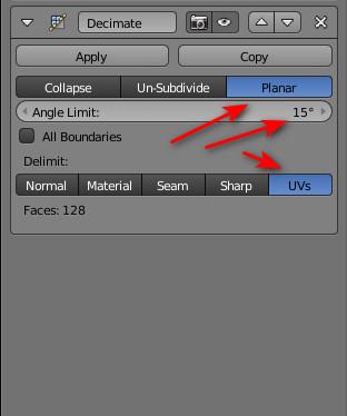 Я по дефолту использую Planar, увеличиваю цифру Angles Limit и Delimit: UVs. После этого наблюдаю за Faces который уменьшается. После этого смотрим на модель после результата и если вас все устраивает, то нажимаем Apply.