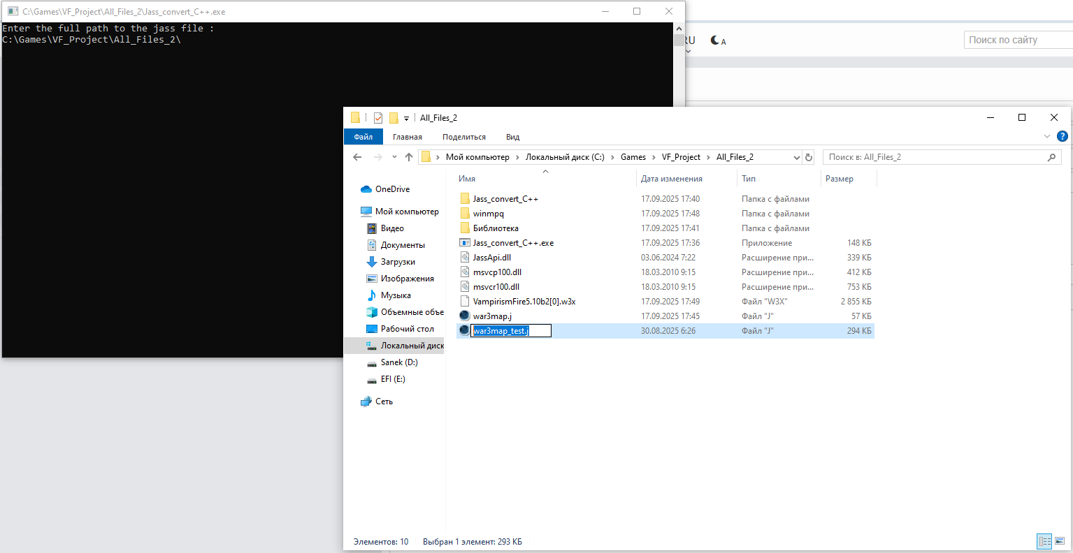 - Можно копировать в консоли нажимая вторую кнопку мыши буфер обмена, а именно текстовые данные, для ввода пути к ".j" файлу, который в итоге, если полный путь корректен и расширение нужное, то вы получите два файла war3map.cpp и war3map.h.