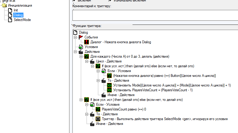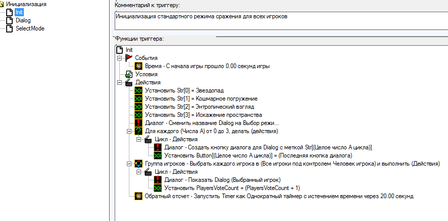Недавно реализовал голосование в тригерах и все работало в одиночной игре, но в случаи если игроков 2+ то все зависают и игра заканчивается, не могли-бы исправить и сказать где была допущена ошибка?А так-же я хотел бы реализовать mods / mods2 дабы у всех игроков после n секунд оффался-бы диалог но он не работает.