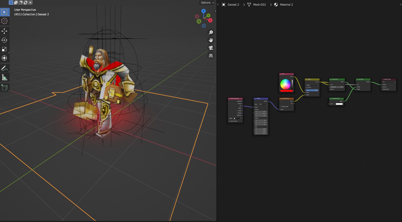 The importer will auto-generate node setups for all materials. If a material layer uses an image, the importer will attempt to load a .PNG file with the same name in the same folder as the source model - so if you have extracted all textures before importing, the model will look as in-game out of the box. Team color is represented by a solid red RGB node, team glow by a red-tinted spherical gradient, and replaceable textures by a checker texture. Vertex coloring will be multiplied in. Overall, the system will create mix nodes to combine layers in quite a sophisticated way, and set the correct alpha output (though keep in mind that if the image is missing, the alpha will be null, making the material appear transparent in previews)