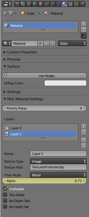 This exporter comes with a custom material editor which will attach extra MDL properties to the materials in your file. A material consists of multiple material layers, which will be rendered from top to bottom, and blended together using the specified filter mode. Some filter modes support an additional alpha multiplier, which can be animated. To add a texture animation, create a mapping node in the node graph with the same name as your layer, and animate its properties.