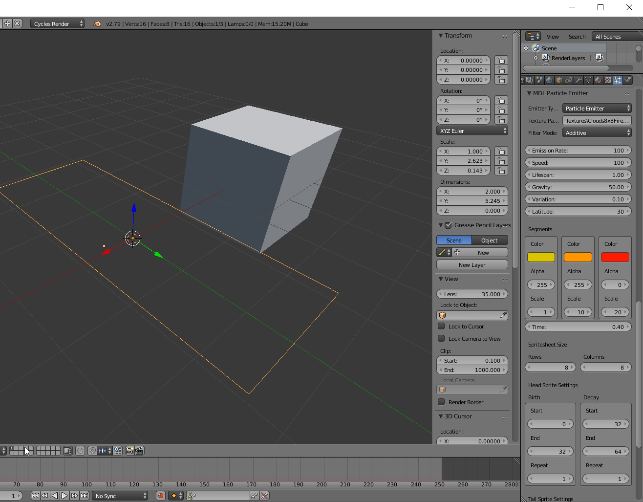 The exporter has a custom editor for configuring particle systems. The data piggybacks on the Blender ParticleSystemSettings data block, so you need to create a particle system to make the MDL particle editor appear. This also allows for shared particle data among emitters - just remember to make it single-user first if you copy one so that you don't overwrite your old data. I've chosen to name the emitters "Model Emitter", and "Particle Emitter" rather than "ParticleEmitter" and "ParticleEmitter2", since it's more descriptive of what they do. Ribbons are also supported. The bounds of whatever object the particle system is attached to defines the width and height of the emitter - animating the X/Y scale of the object will animate the width and length of the exported emitter. Make sure not to apply the scale of the emitter since this will set the width/length to be 1 regardless of the actual emitter size (fix for this is in the works).