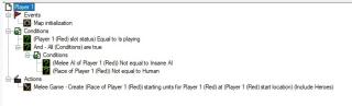 Подскажите плз кто знает в чём проблема, я хочу сделать такое условие: Красный игрок не должен быть Сложным ИИ который играет за альянс! Если так, то создать на стартовой позиции ему юнитов... Но оно не работает!