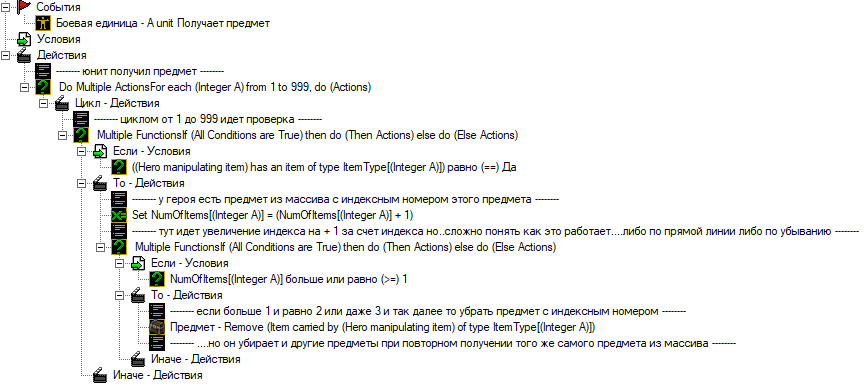 ясень перец что накосячил...хоть цикл придуман чтобы он ПОвторял одно и тоже действие такоето кол-во раз..вот принцип как я задумал использовать этот механизм...завел переменную и сразу указал ЧТО за предмет с порядковым номером этого предмета, Завел переменную которая будет выступать в качестве цикла при получении предмета ИЗ МАССИВА...цикл задумался в качестве проверки МАССИВА предметов 1 порядковый номер 2 и так до 999 предметов...потом при получении этого предмета из массива увеличить порядковый номер на 1 за счет предмета с порядковым номером и далее проверить проверить порядковый номер...если таких предметов 2 то убрать предмет...но цикл неправильно работает....
