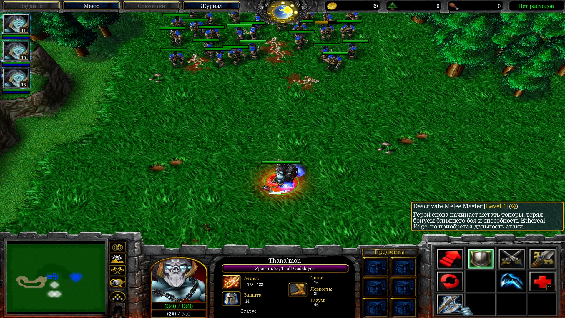 Зависит от типа атаки героя - то есть от первого скила, так же пилит деревья