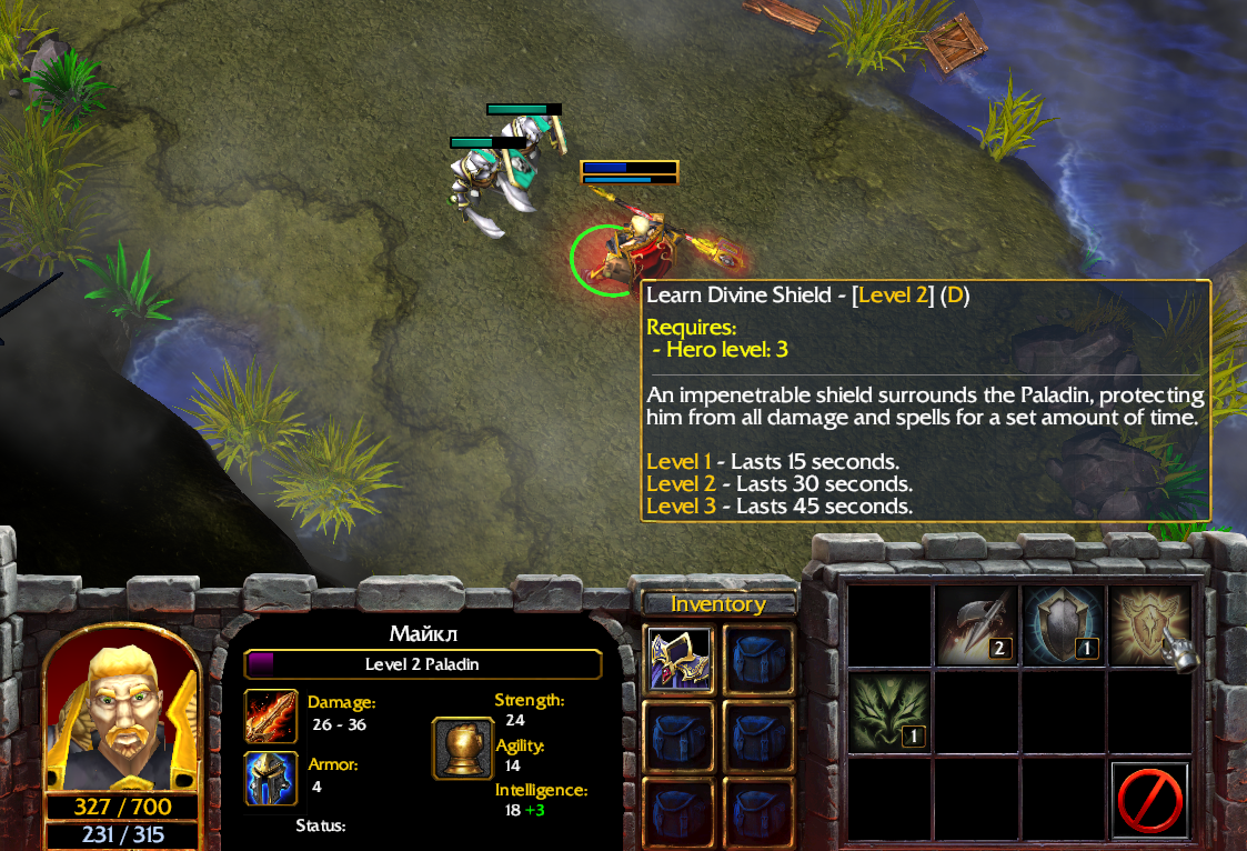 1. Есть остров с лавкой гоблинов и лагерем наёмников - но наёмников купить нельзя, так как нету пищи для найма. Стандартный набор товаров в Лавке Гоблина тоже не очень актуален - зелье неуязвимости на 7 секунд не очень нужно паладину, который может становится неуязвимым на 15-45 секунд. Невидимых врагов нет, следовательно, порошок прозрения тоже можно убрать или заменить чем-то.