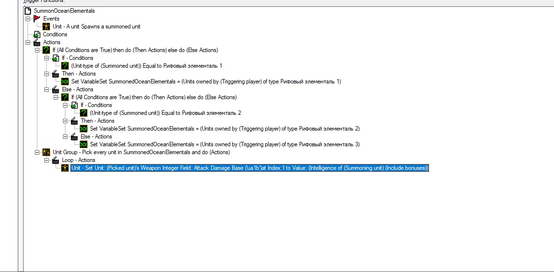 У тебя тут вообще все лишнее. Тебе нужно всего лишь одно действие: "Добавлять атаку призванному существу в зависимости от типа юнита" Всё.