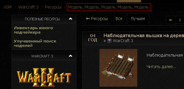 Здравствуйте. Меню раздела глючит - при выборе ссылок снизу выкидывает на общий список ресурсов всего раздела. Видимо, проблема с тегами. По сути, доступа к тем ресурсам, из меню раздела WC3 пока что нет. Например, в раздел моделей я попал сейчас только через обходной путь (через тег внутри страницы ресурса). Сделайте что-нибудь, исправьте ошибки ссылок. Благодарю.