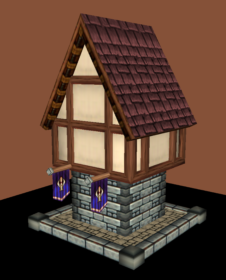 Сделал ещё пару элементов у здания. Я всё думаю над тем, что написал LongbowMan - "Не думал как-то разнообразить силуэт и добавить чего-то агрессивного? Всё-таки там суровые головорезы обитают, которые за денюжку и флот потопят, и маму родную пришьют". Думаю добавить щит и топоры над балкончиком + сделать стенд с типа заданиями и розыском. Ну и ещё как вариант на крыше сделать лежащую шкуру дракона или иного большого зверя(ну или просто свисающие головы огров, орков, троллей и т.д).