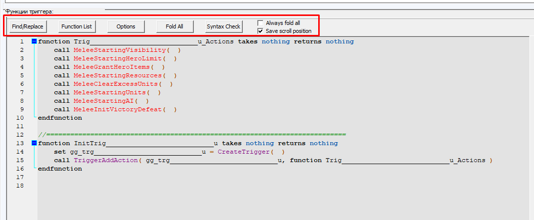 Стандартный редактор карт не имеет удобных средств для программирования. Поэтому, лучше перейти на одну из сборок редактора карт JNGP. Сам по себе он не умеет ничего такого необычного, но дополнительные модификации, входящие в состав сборки, принесут много полезного функционала. Больше всего нас интересует модификация TESH. Она позволяет менять шрифт для кода, добавляет подсветку и автодополнение кода и т.д. Её НЕ нужно устанавливать вручную, она уже есть в сборках.