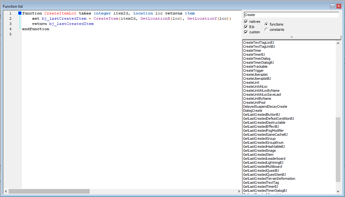 Нажав TESH -> Function list нам откроются все необходимые знания, шучу =). Нам откроется окно со всеми стандартными функциями и константами, а также поисковой строкой. Здесь можно смотреть какой функционал вообще существует в джассе и как его использовать. Это своего рода шпаргалка по функциям JASS. Очень полезная штука, вы будете очень часто сюда заглядывать.