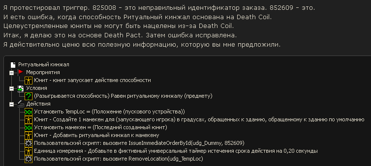 Здравствуйте. Помогите пожалуйста перенести ритуальный кинджал из рефорджа в патч 1.26а. На сколько я поняла напрямую нельзя перенести, но нашла данный триггер (типо создаешь вручную) и я не могу создать этот триггер в вордэдиторе, так как нет опыта.