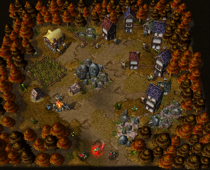 Теперь,мы ставим пехотинцев и одного капитана,и шатры. Если что шатры в нейтрально пассивных. А да,еще можно поставить орков, типа они пришли грабить. И ставим людей.