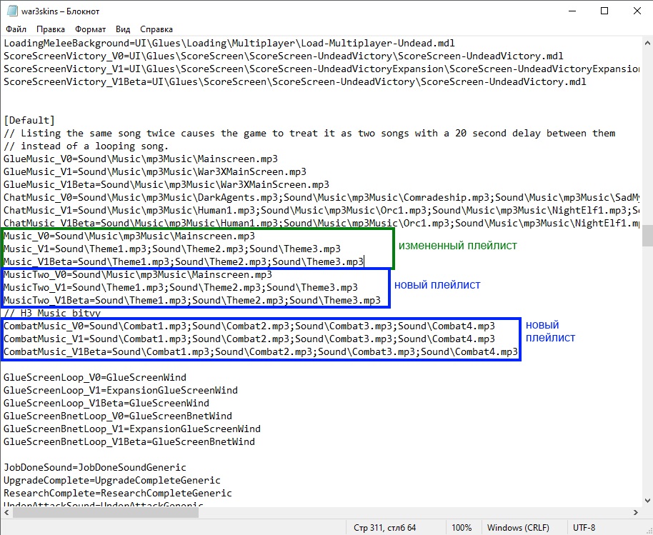 Пожалуй, по созданию плейлистов всё. Также в war3skins можно таким образом менять иконки,интерфейс UI (оформление, курсоры, звуки), модели, шрифты, модели в главном меню и многое другое.