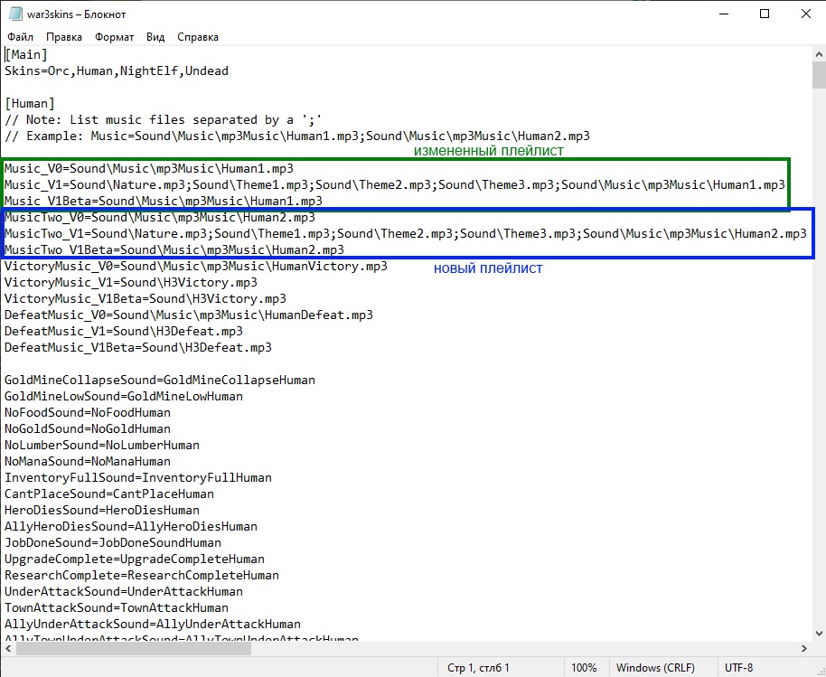 Если Вы хотите изменить плейлист расы игрока, и/или у Вас в моде больше 4 рас, Тогда нужно добавить новые плейлисты в разделы [Human], [Orc], [NightElf], [Undead] под одинаковыми именами. Принцип показан на скриншоте.