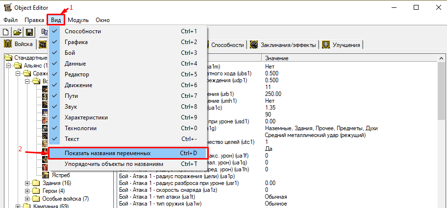 Посмотреть какой ИД у юнита, декорации или способности можно в редакторе объектов. Для этого зайдите в редактор объектов и нажмите на вкладку Вид -> Показать названия переменных. Также это можно сделать нажав комбинацию клавиш Ctrl+D.
