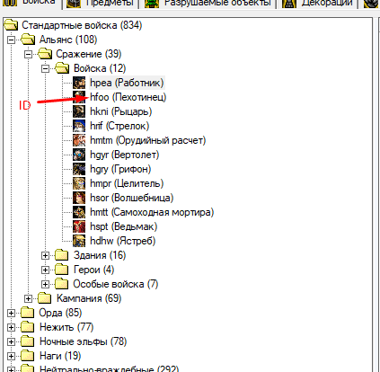 Теперь нам будут показаны ИД всех типов юнитов, декораций и способностей...