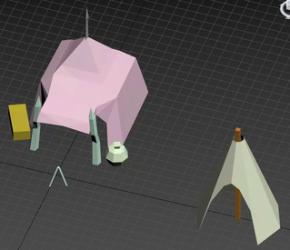 Добавил грубую стойку с оружием рядом с левой палаткой.