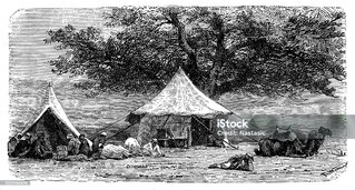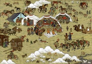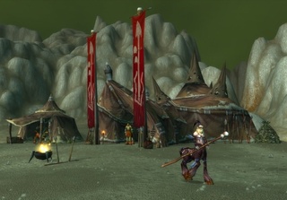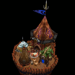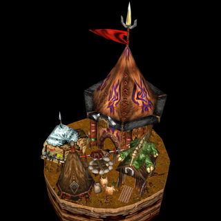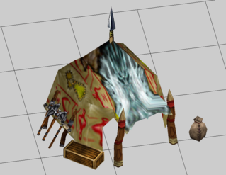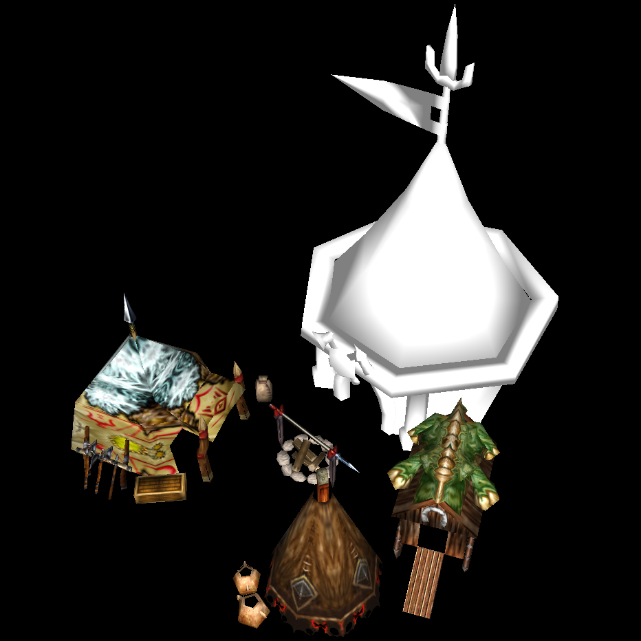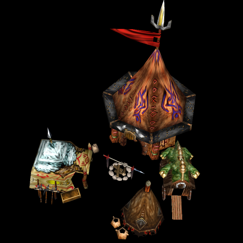 Кентавры - жестокие кочевники пустошей. Сперва я хотел, чтобы их лагерь выглядел как сугубо временная остановка в пустыне. Однако это сильно ограничивало выбор декораций. Пришлось пойти на допущения. Взглянув на то, как лагеря кентавров выглядят в WoW, я решил использовать некоторые элементы оттуда для создания шатров, особенно самого крупного. Также я просматривал изображения монгольских и бедуинских стоянок. Чтобы подчеркнуть кочевой образ жизни, с одной из таких картинок был скопирован деревянный фургон. В центре расположил костёр, на котором жарится минотавр.