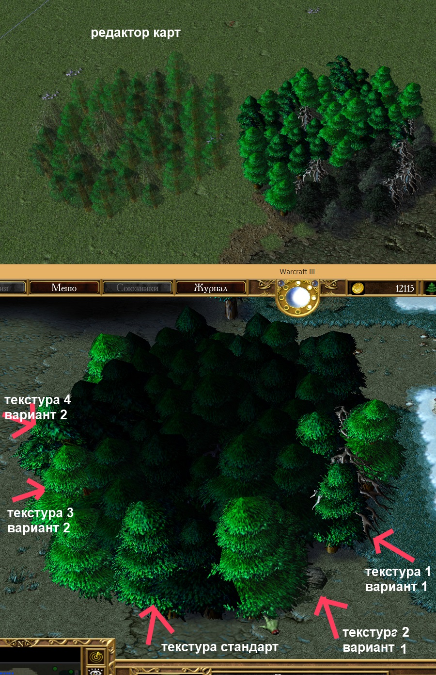 в редакторе слева - выбранные деревья мышкой, справа - поставленные.