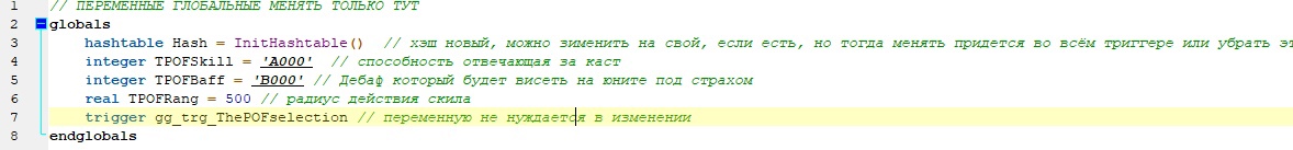 - (не обязательно) настраиваем дальность действия в переменной TPOFRang, она должна совпадать с "областью воздействия" в скилле.