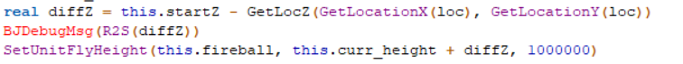 Все равно не хочет работать, шар все равно прогинается под воду, когда пролетает над ней. При этом diffZ принимает нормальные значения(т. е. на такой же высоте, как и откуда он вылетел - 0, а если высота отклоняется от начальной, о 20, 86 и тд). В startZ - начальная высота местности откуда произошел каст. А в diffZ - разность между текущей высотой местности и начальной и это добавляеться к изменению высоты юнита. По логике вещей он должен не прогинаеться под воду, но так все равно происходит.