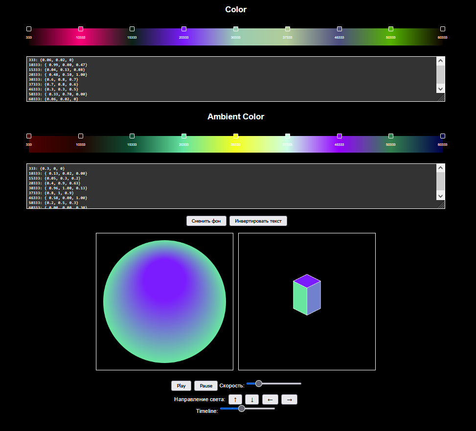Функция: включает/останавливает анимацию времени суток, влияющую на градиенты Color и Ambient Color на сфере и кубе.