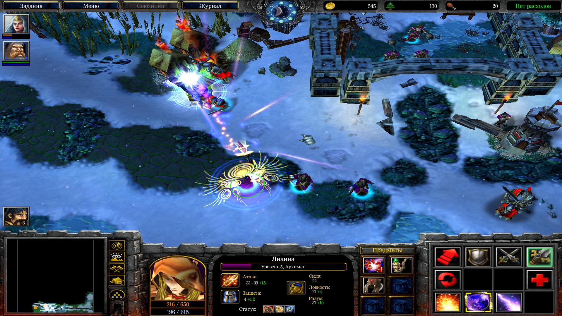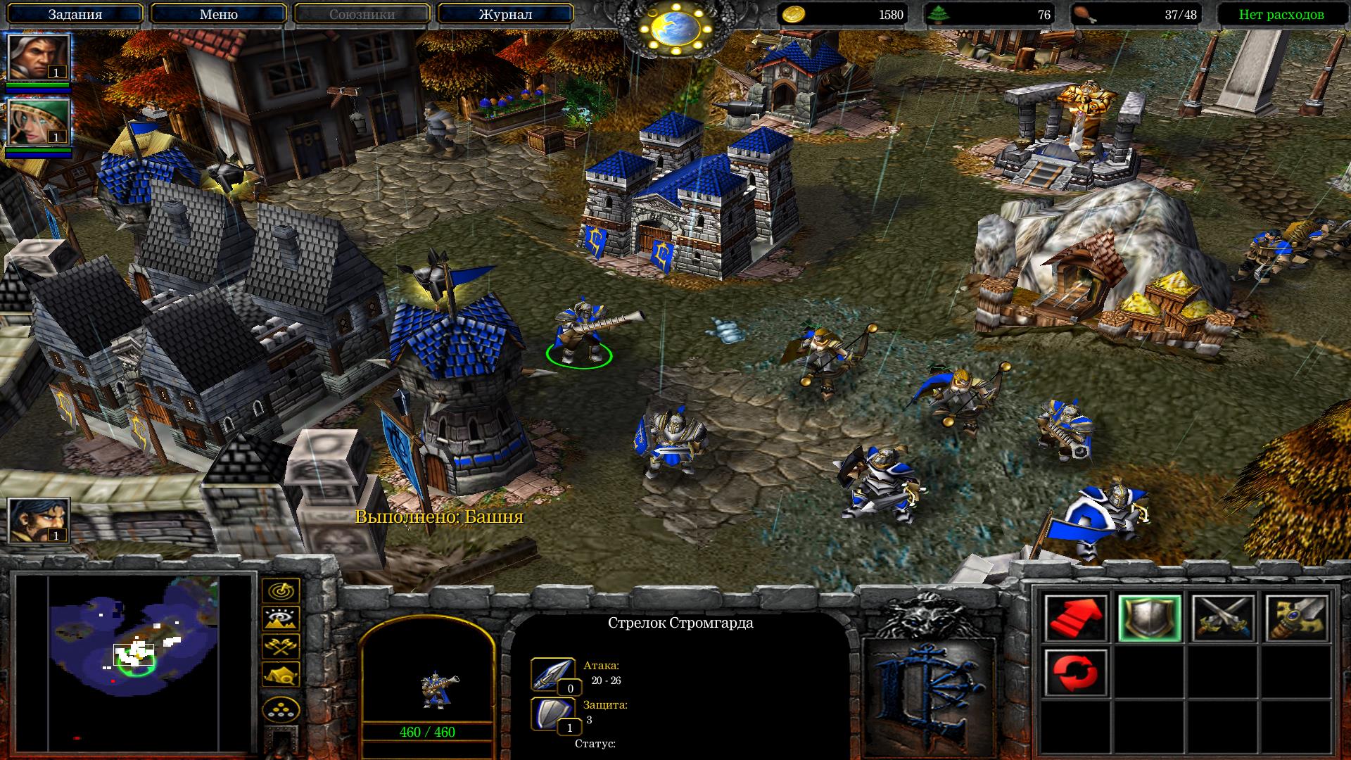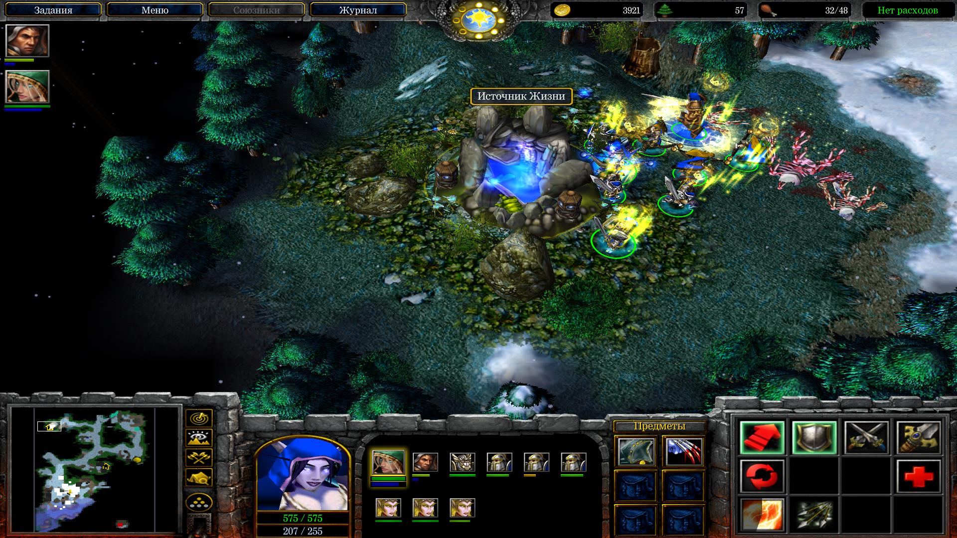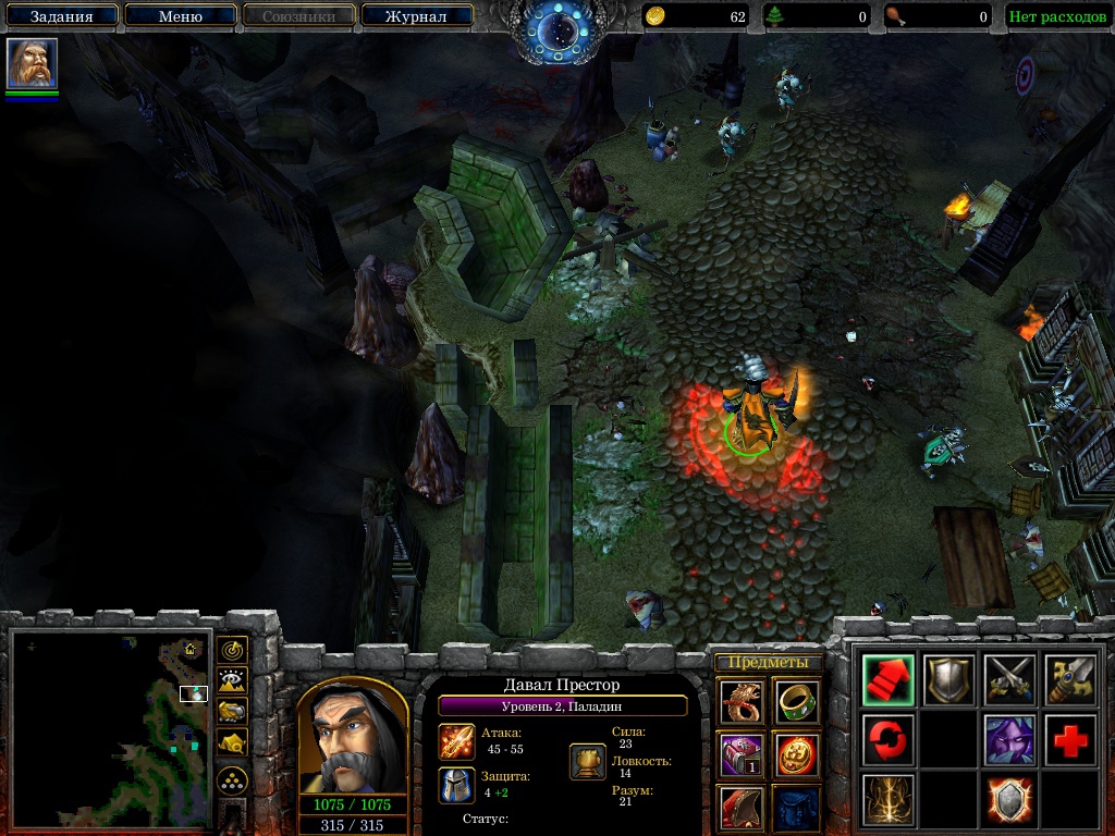 Построй несколько башен для защиты всех куч, что на тебя будет валиться почти сразу же. Разбей справа от своей базы отряды нежити и освободи мужика, он даст тебе книгу некромантии. Возьми ее, она тебе очень сильно пригодится во время защиты базы от очередной безумно сложной волны Орды.