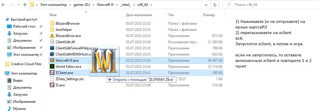 - Теперь, когда скачали Warcraft 3 reforged , зарегистрировались в zloemu, в папке x86_64 файл «Warcraft 3 .exe» перетаскиваем на иконку ZClient.exe
