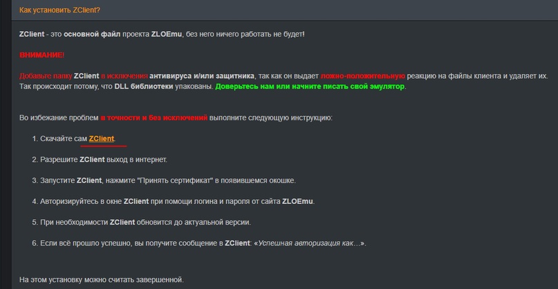 - После успешной регистрации, скачиваем Zclient по ссылке - zloemu.net/faq?id=7