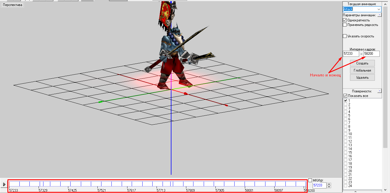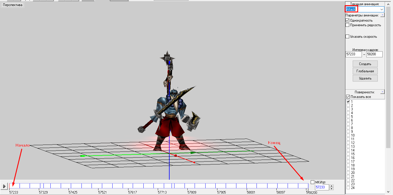 Для того что бы была видна анимация вовремя атак, нужно узнать кадры взмаха. У Примерного персонажа две атаки. Давайте сначала узнаем какие кадры на первой атаке: